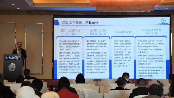 会上,机械工业教育发展中心郑丽梅主任、黑龙江职教学会李东阳会长、赵伟副会长、哈尔滨科学技术职业学院解海书记共同为“中文+职业技能国际合作联盟”揭牌启动。联盟由国际中文教师协会联合马来西亚育英教育集团、泰国暹罗大学、泰国罗勇工业园等中外科研院所、产业园区及中资企业等共同牵头成立。联盟副秘书长张萌在工作介绍及规划中指出,统筹做好职业教育“ 引进来”和“走出去”是新一轮国家“双高计划”建设的重要内容,将深化拓展海外工坊建设、组建专家团队、中文教师、培训认证、国际合作办学、国际技能竞赛等方面的交流合作,期待企业和院校的参与。