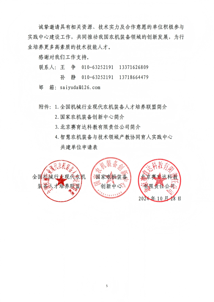 为加快现代智慧农机装备与技术创新链、产业链、技术链、教育链融合发展,推动智慧农机装备与技术领域紧缺人才培养,全国机械行业现代农机装备人才培养联盟、国家农机装备创新中心和北京赛育达科教有限责任公司联合开展智慧农机装备与技术领域产教协同育人实践中心共建工作,每季度开展共建单位征集活动,共同探索农机装备领域区域产教融合的新模式、新路径。2025年季度征集活动持续进行中,欢迎联系咨询、报名。