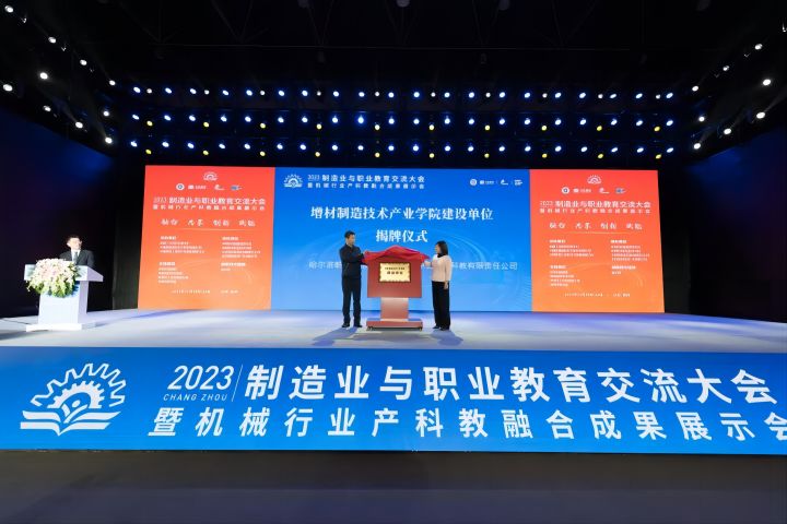 11月10日,在2023制造业与职业教育交流大会暨机械行业产科教融合成果展示会期间,北京赛育达科教有限责任公司总经理耿东川分别与哈尔滨职业技术学院、山东职业学院、烟台职业学院、北京市自动化工程学校、北京金隅科技学校等领导共同为增材制造技术产业学院建设揭牌,预示着增材制造技术产业学院项目经过近两年的策划对接,正式进入启动建设阶段。