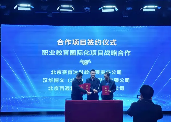 会议最后,北京赛育达科教有限责任公司、汉华博文(北京)教育科技有限公司、北京百通科信机械设备有限公司就职业教育国际交流合作举行职业教育国际化项目签约仪式,将共同开展“一带一路”沿线国家的师资及人才培养、实训基地建设、教学资源标准开发、国际产教融合、师生交流互访等一揽子项目。