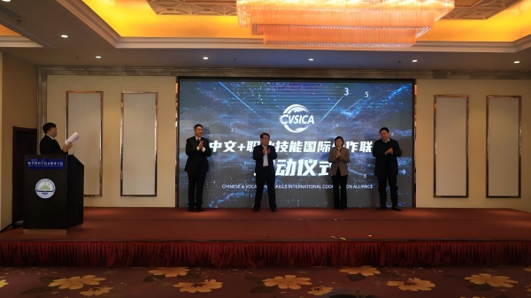 会上,机械工业教育发展中心郑丽梅主任、黑龙江职教学会李东阳会长、赵伟副会长、哈尔滨科学技术职业学院解海书记共同为“中文+职业技能国际合作联盟”揭牌启动。联盟由国际中文教师协会联合马来西亚育英教育集团、泰国暹罗大学、泰国罗勇工业园等中外科研院所、产业园区及中资企业等共同牵头成立。联盟副秘书长张萌在工作介绍及规划中指出,统筹做好职业教育“ 引进来”和“走出去”是新一轮国家“双高计划”建设的重要内容,将深化拓展海外工坊建设、组建专家团队、中文教师、培训认证、国际合作办学、国际技能竞赛等方面的交流合作,期待企业和院校的参与。